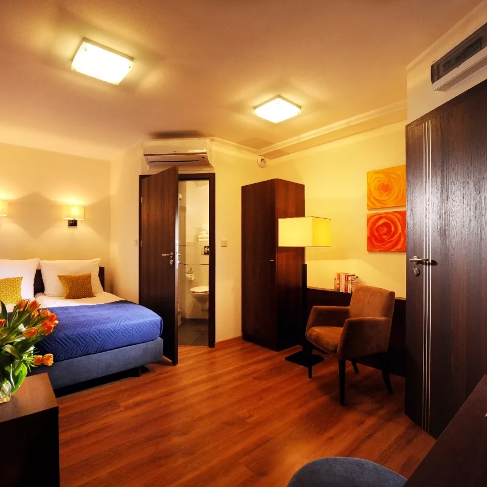Pokój z podwójnym łóżkiem. Wyposażony w biurko z krzesłem, fotel lub sofę, telewizor LCD, minilodówkę, klimatyzację, kosmetyki hotelowe, szlafrok, kapcie, suszarkę, wodę mineralną, zestaw do przygotowania kawy i herbaty. Łazienka posiada prysznic. Dostępne bezpłatne, szybkie Wi-Fi. Pokój z widokiem na ogród lub miasto.