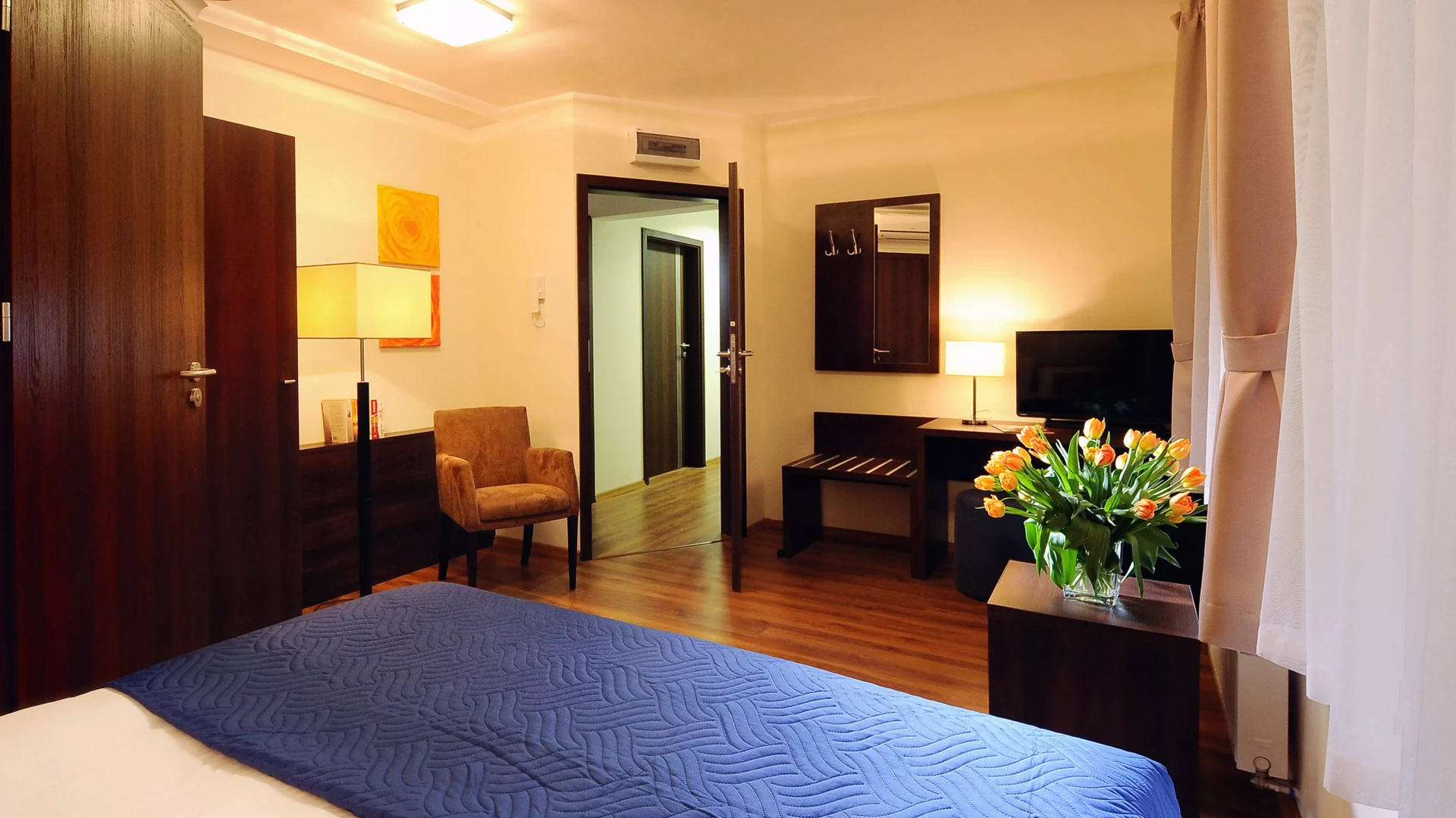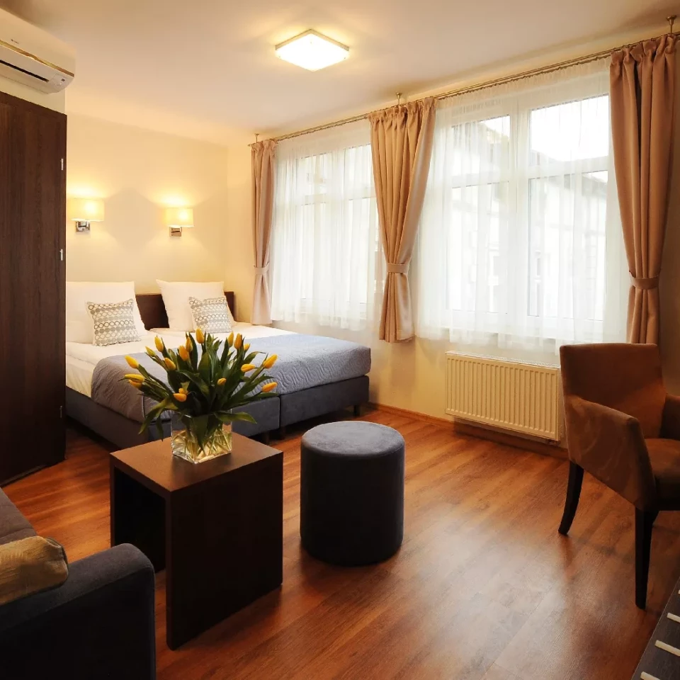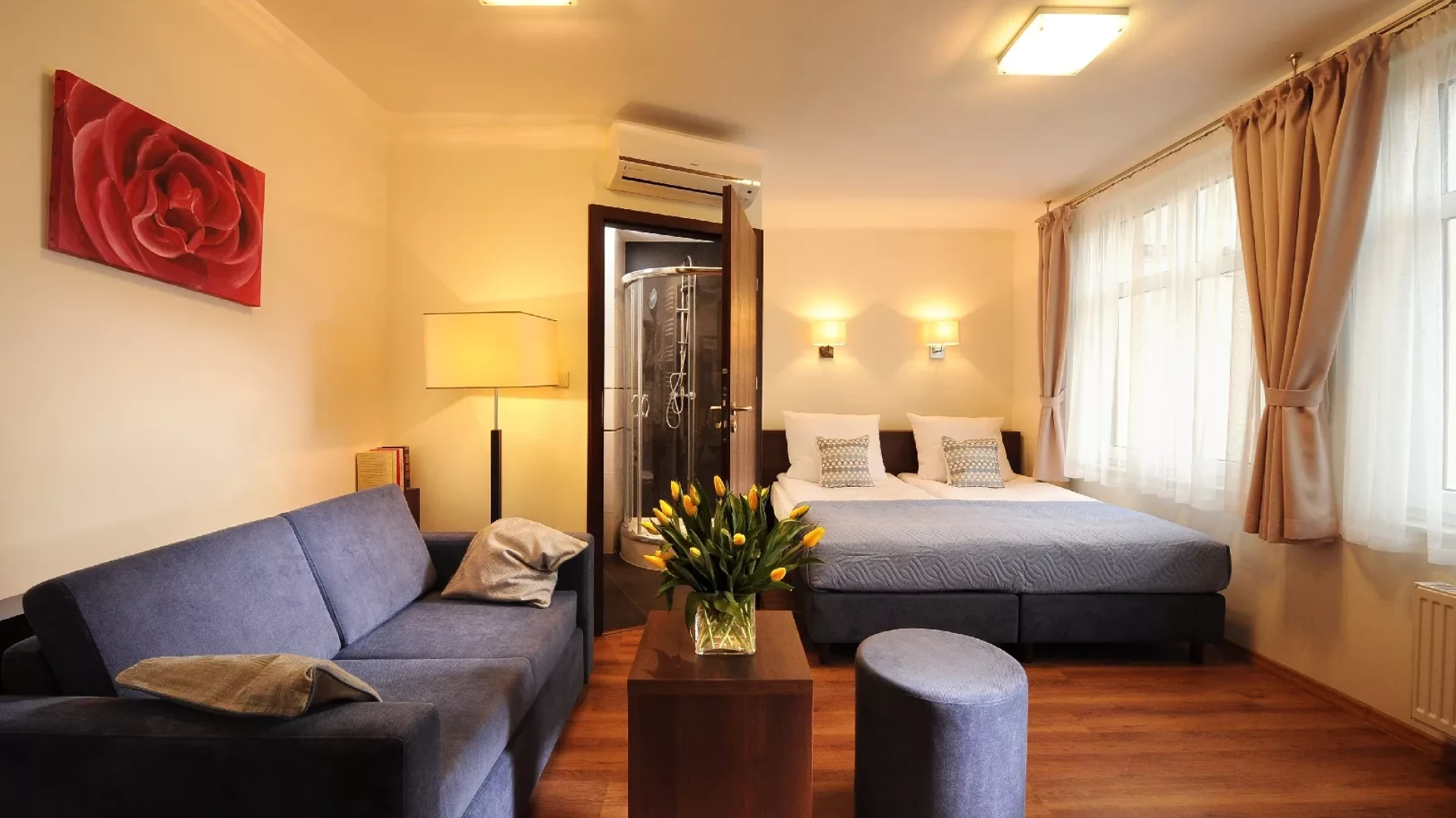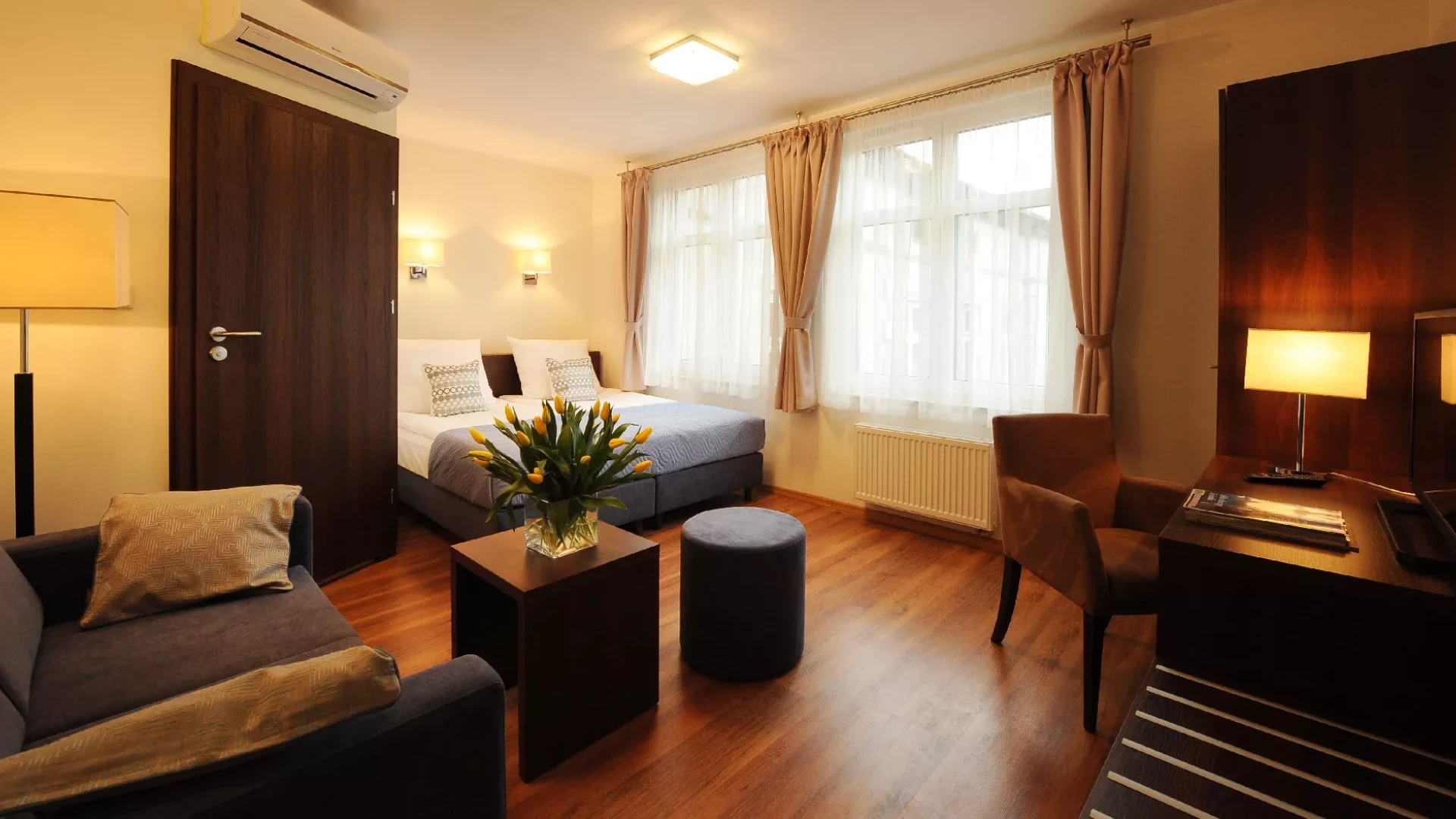 Pokój z podwójnym łóżkiem i jednym pojedynczym lub trzema pojedynczymi. Wyposażony w biurko z krzesłem, fotel lub sofę, telewizor LCD, minilodówkę, klimatyzację, kosmetyki hotelowe, szlafrok, kapcie, suszarkę, wodę mineralną, zestaw do przygotowania kawy i herbaty. Łazienka posiada prysznic. Dostępne bezpłatne, szybkie Wi-Fi. Pokój z widokiem na ogród lub miasto.