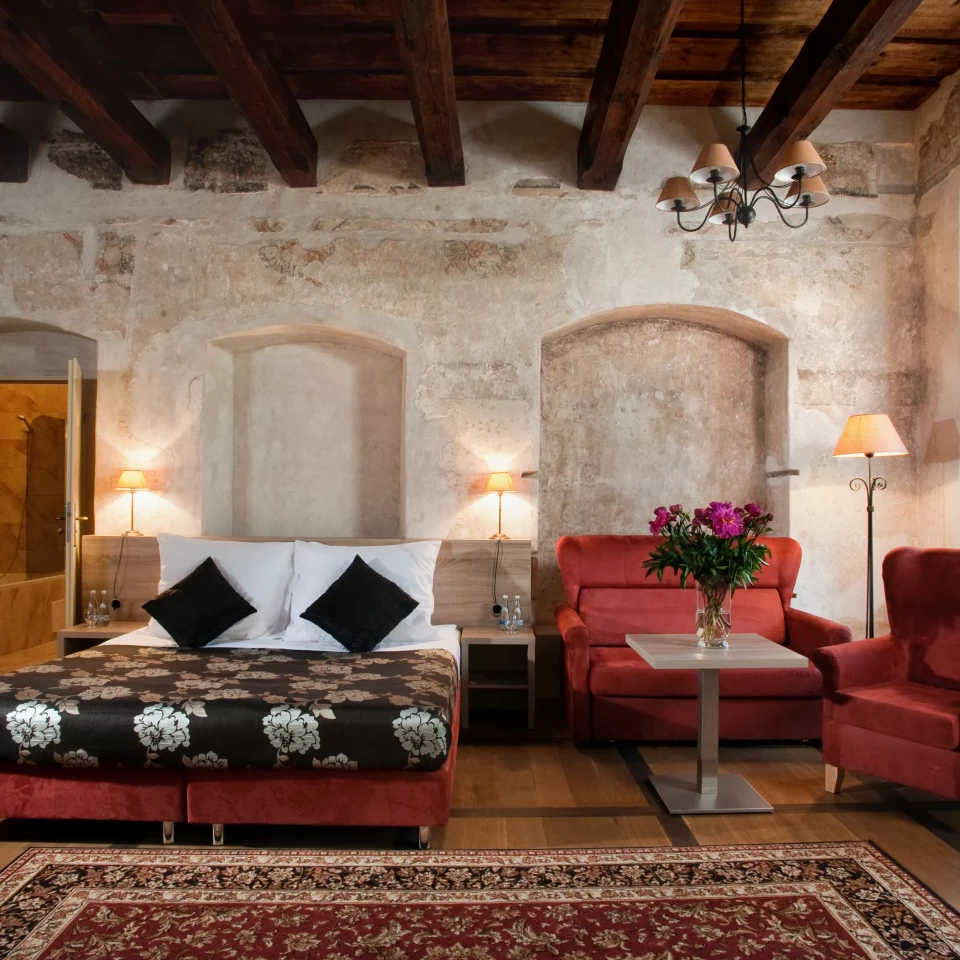 The deluxe rooms are decorated with paintings on the walls, wooden elements or an exposed brick wall, which perfectly reflect the historical aspect of the building and allow you to experience the real history of the building.