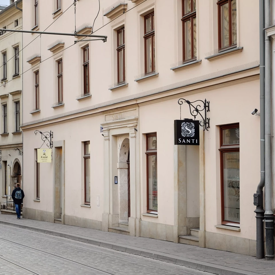 The tenement house of Hotel Santi is located in the very centre of Krakow, in the vicinity of the Dominican Church, All Saints' Square and Grodzka Street - part of the former Royal Route. All the monuments of the Old Town can be visited on foot; the Cloth Hall and St. Mary's Basilica are only 350 metres away (about 3 minutes' walk) and the Wawel Royal Castle 550 metres away (about 7 minutes' walk).
